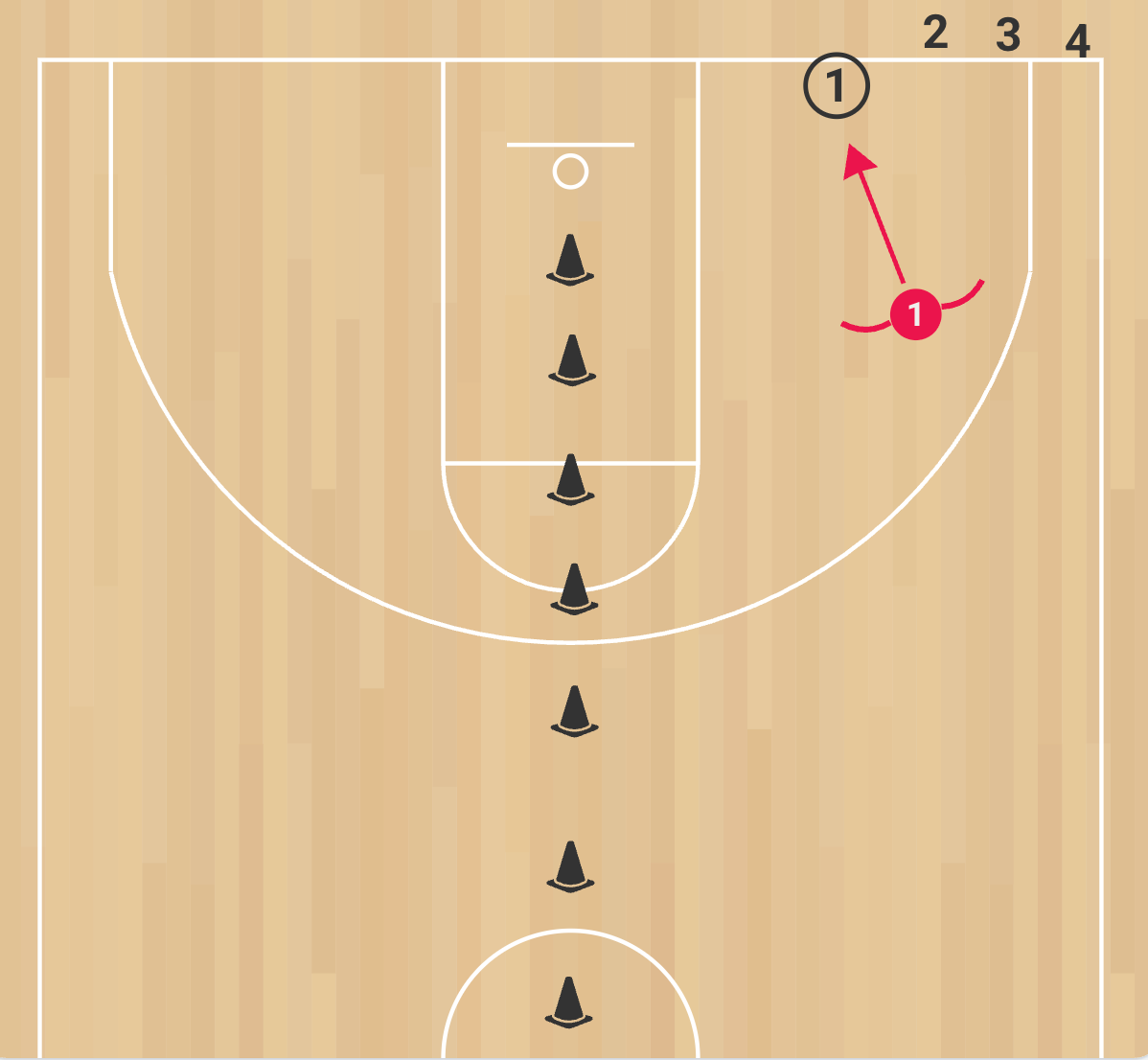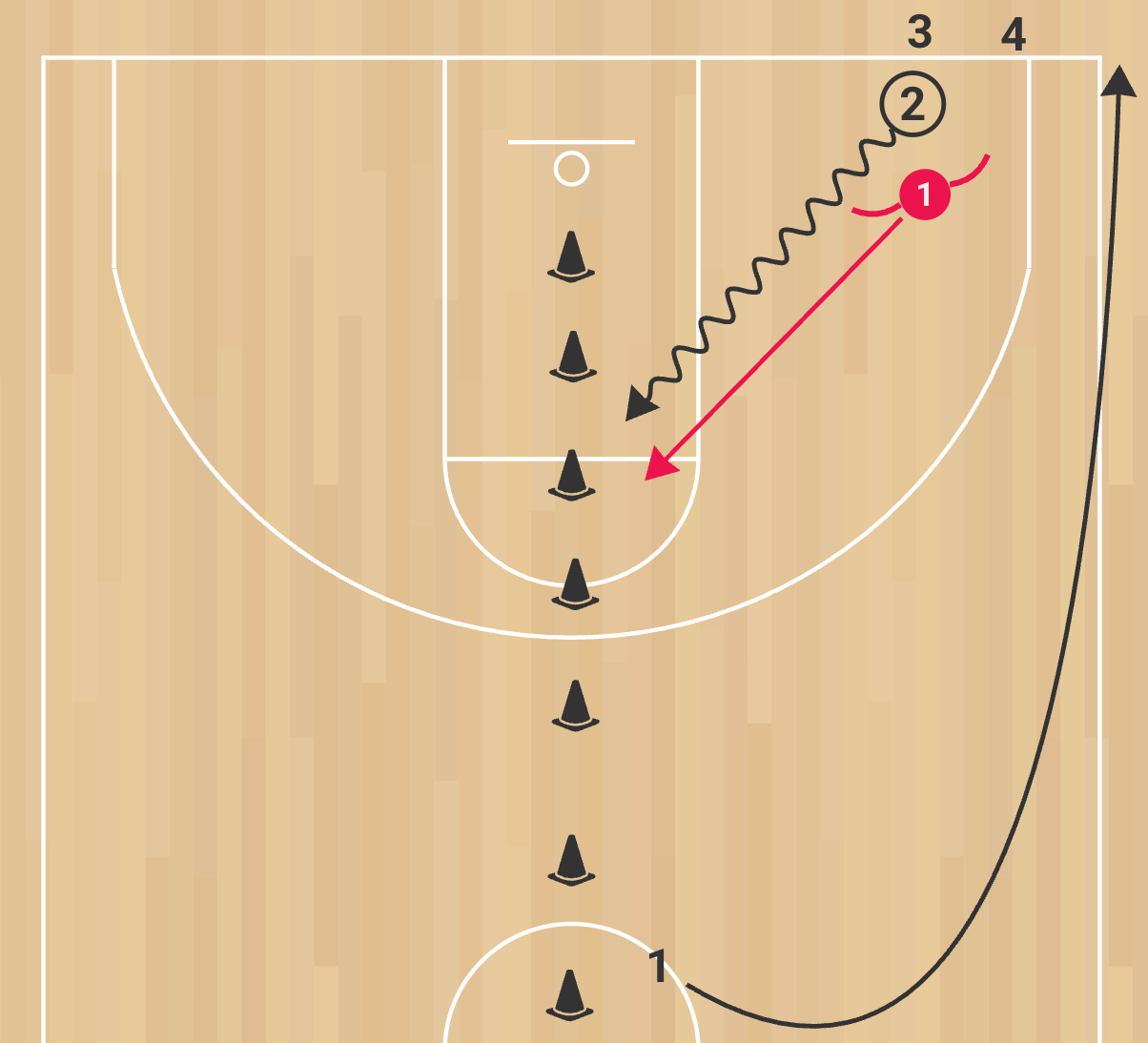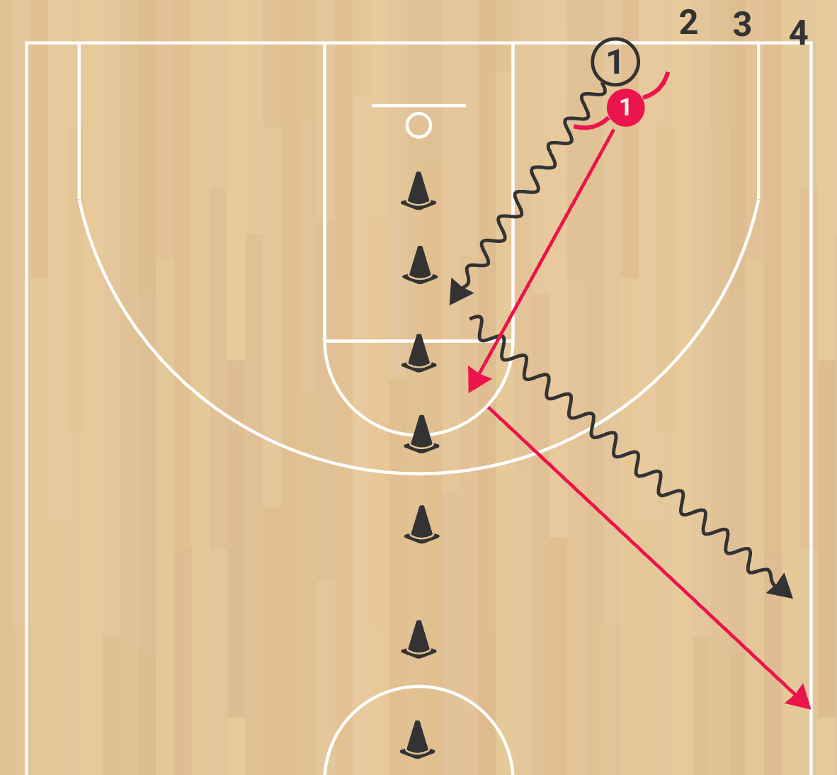 Officiate tightly: stepping on the cone line is out-of-bounds and a defensive stop. Demand low hips, quick slides, chest on hip, and angle the drive toward help space—not straight down the lane. No reaching; move your feet. Reset instantly after each rep to build conditioning and composure under fatigue. Offense should attack with speed and body control inside the lane only.