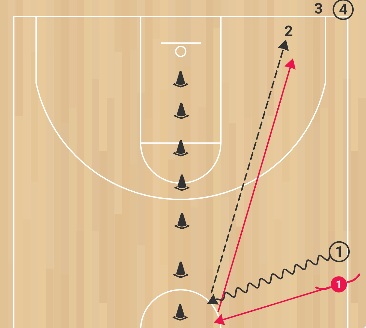 Run two or four lanes simultaneously to increase reps. Vary the lane width to scale difficulty. Start the defender in a slight trail to simulate disadvantage. Add a coach at half court flashing numbers the ball handler must call out to train eyes-up dribble under pressure.