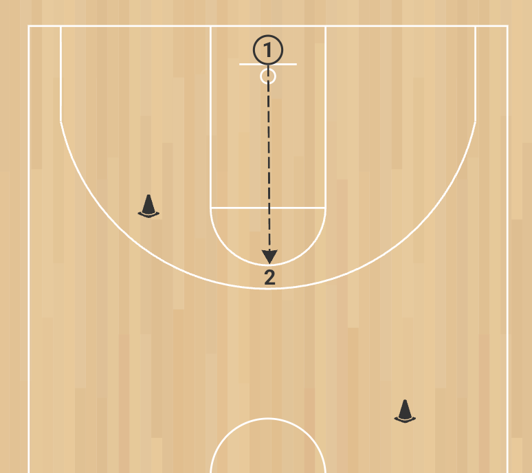 3. The offensive player catches, dribbles full speed around the half-court cone, and attacks the rim.