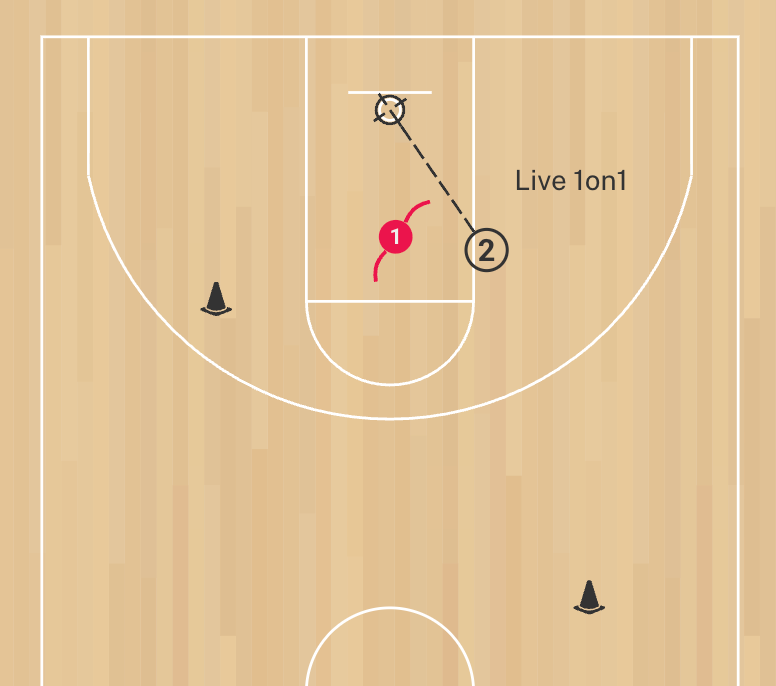 1. The defender starts under the basket with a ball; the offensive player starts at the top of the key.