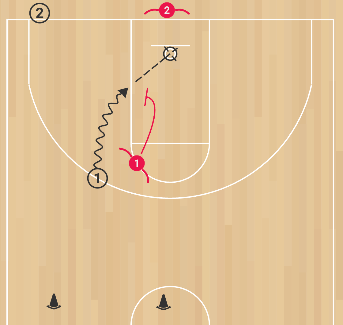 Use half a court. Place two cones at half court: one on the sideline and one inside the jump circle. Offensive players line up in the baseline corner with a ball each. Defensive players line up under the basket. One offensive and one defensive player step in per rep.