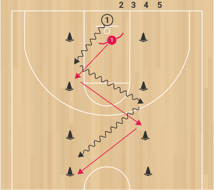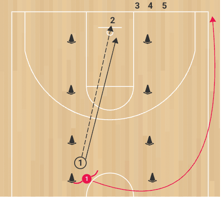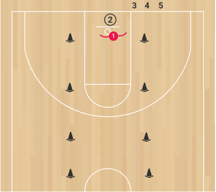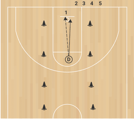 Use half a court only. Place two cones along each sideline to create a “tunnel” about one lane wide, stretching from the baseline up to half court. Offensive players line up on the baseline with a basketball. Defenders line up under the basket. Each rep begins with one offensive player and one defender in the tunnel.
