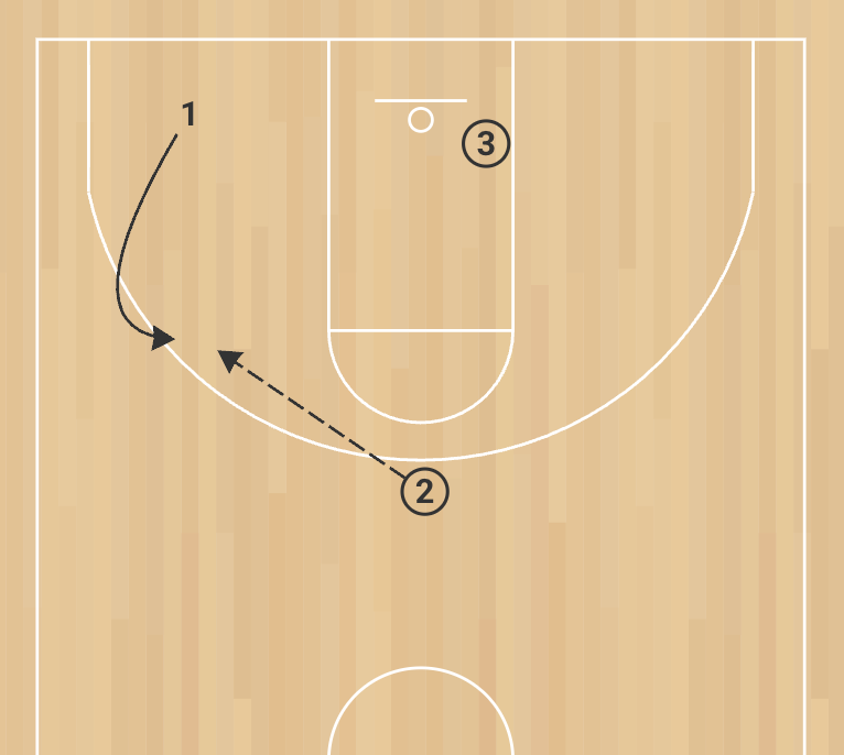 1. Player 1 cuts to an open spot outside the paint with active feet and hands ready to receive. Player 2 passes to Player 1 for a catch-and-shoot attempt. Player 1 shoots, then rebounds his own shot.