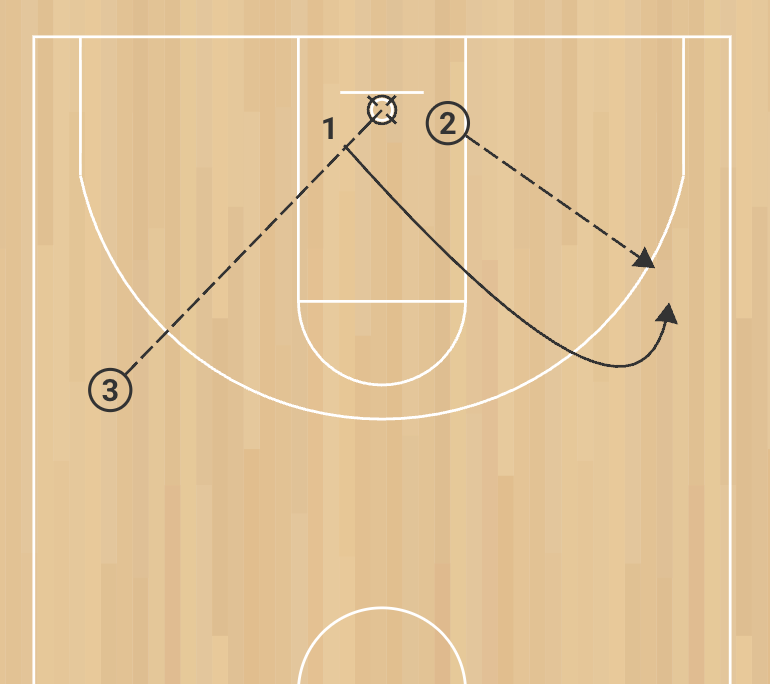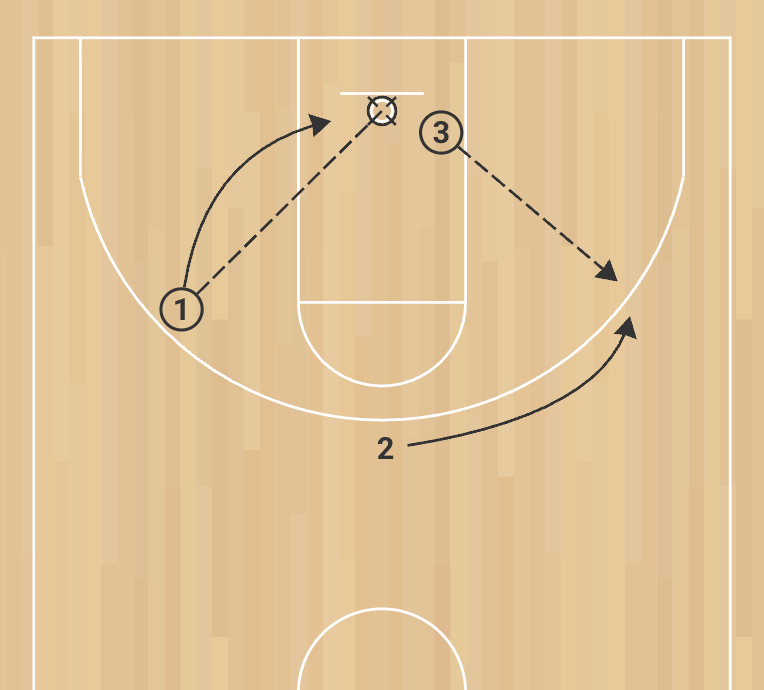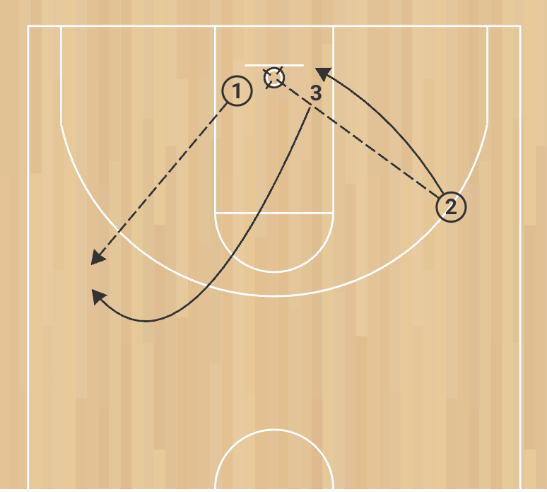 3. After passing to Player 2, Player 3 becomes the cutter. Player 1, now with the ball, delivers the pass. Player 3 shoots, rebounds, and the cycle continues.