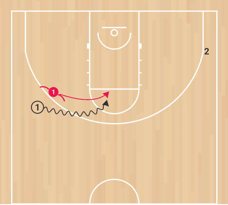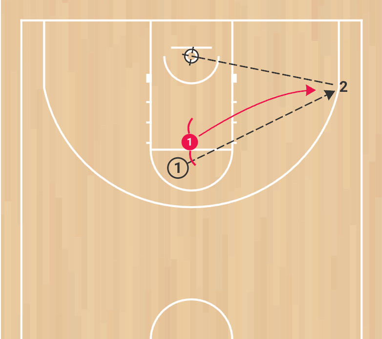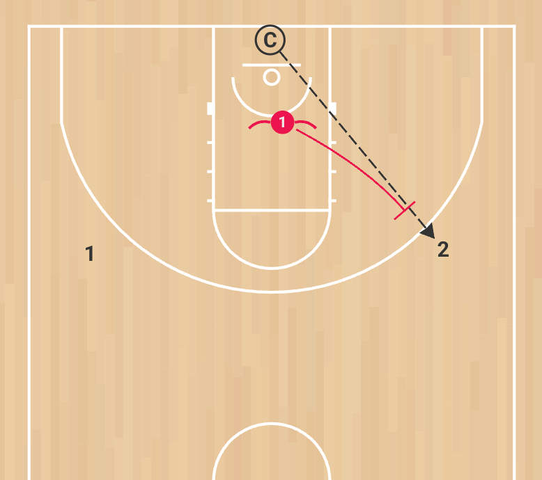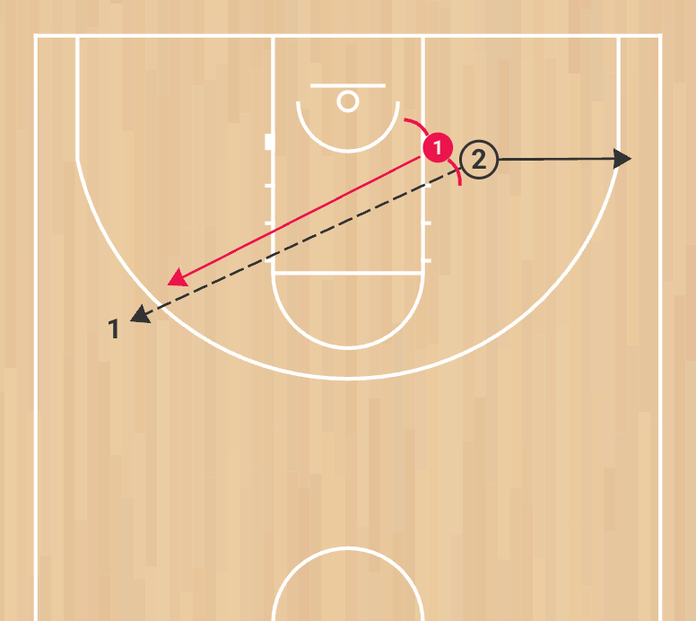 On the pass, the defender must attempt to deflect the ball first, then close out on air time to the second offensive player. The same two-dribble containment applies on the second drive. If the defender again denies a paint touch, the ball is kicked back to the original offensive player for a catch-and-shoot opportunity. The defender must contest the shot and complete the possession with a box-out and rebound, creating a live one-on-one rebounding situation.