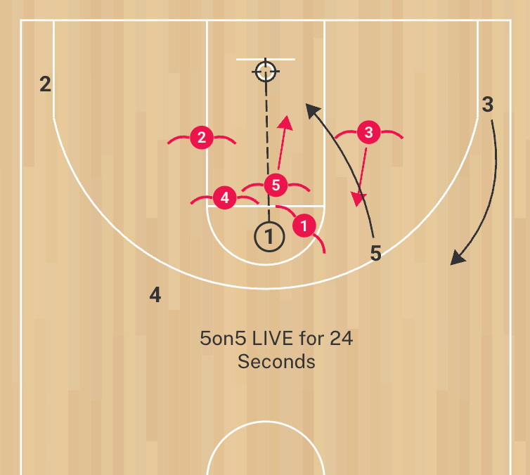 This is a live 5-on-5 drill run with a visible 24-second clock, ideally a shot clock in the gym. If unavailable, the coach can use a stopwatch and call out the time. The offensive team can start in any set, entry, or restriction the coach chooses, while the defensive unit begins by shooting a free throw on the opposite end, flowing into the possession to simulate game conditions.