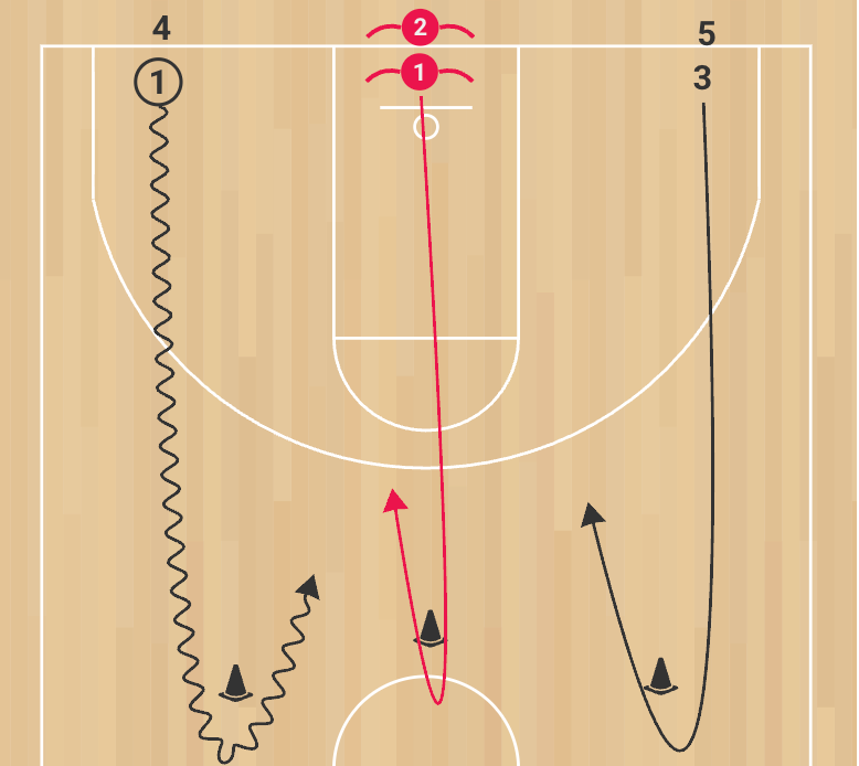 1. The first defender and two offensive players sprint around their assigned cones at half-court.