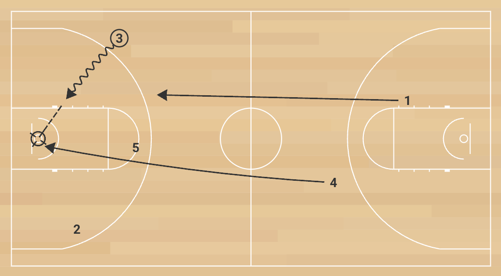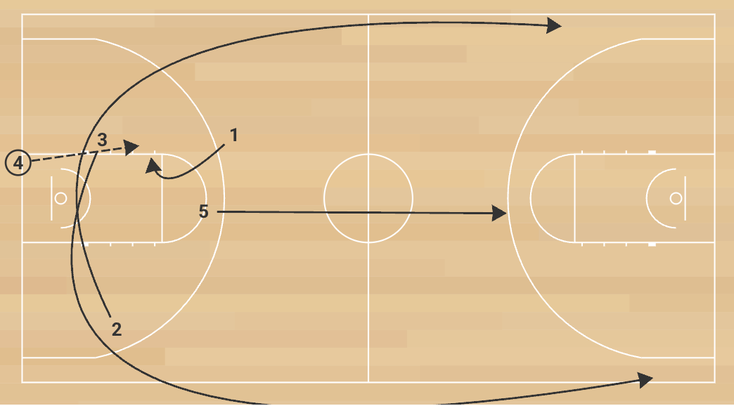 2. After the make, the original outlet passer retrieves the ball from the net, steps out cleanly, and inbounds to the point guard. The unit sprints into lanes again, pushing the ball for another quick score.