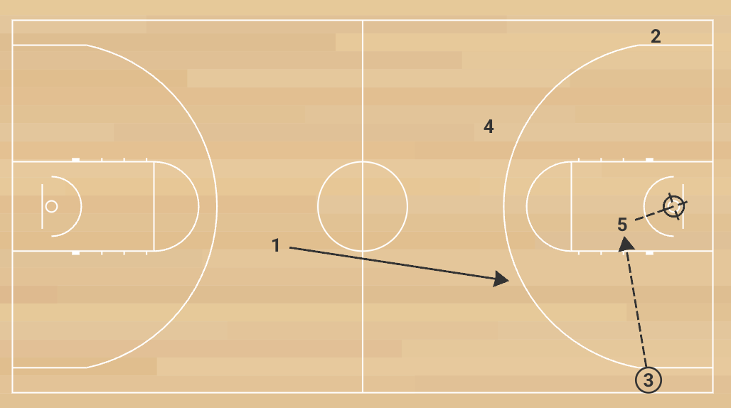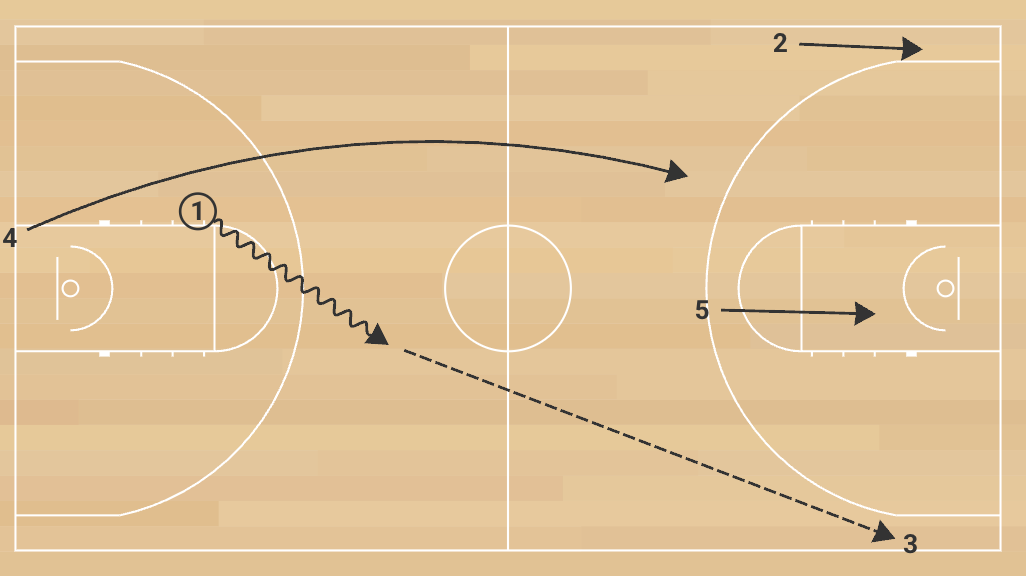1. The drill begins with the rebound simulation and outlet pass. The team runs its primary break, looking for a quick score within one or two passes.