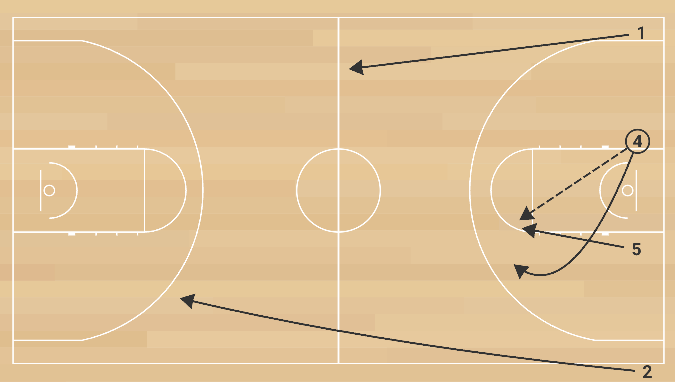 4-Man Break is a high-speed transition passing and conditioning drill designed to emphasize full-court sprinting, precise passing at top speed, and finishing layups under control. It is also a great team-builder, as the rest of the team cheers while four players work together to complete each sequence without mistakes. The drill is only successful if all passes are on target, all layups are made, and the ball never touches the floor.