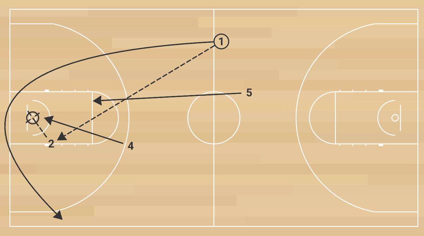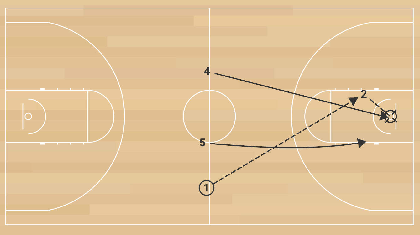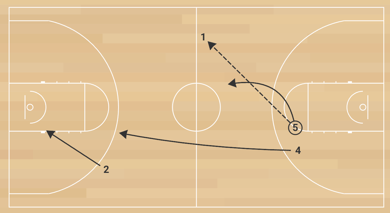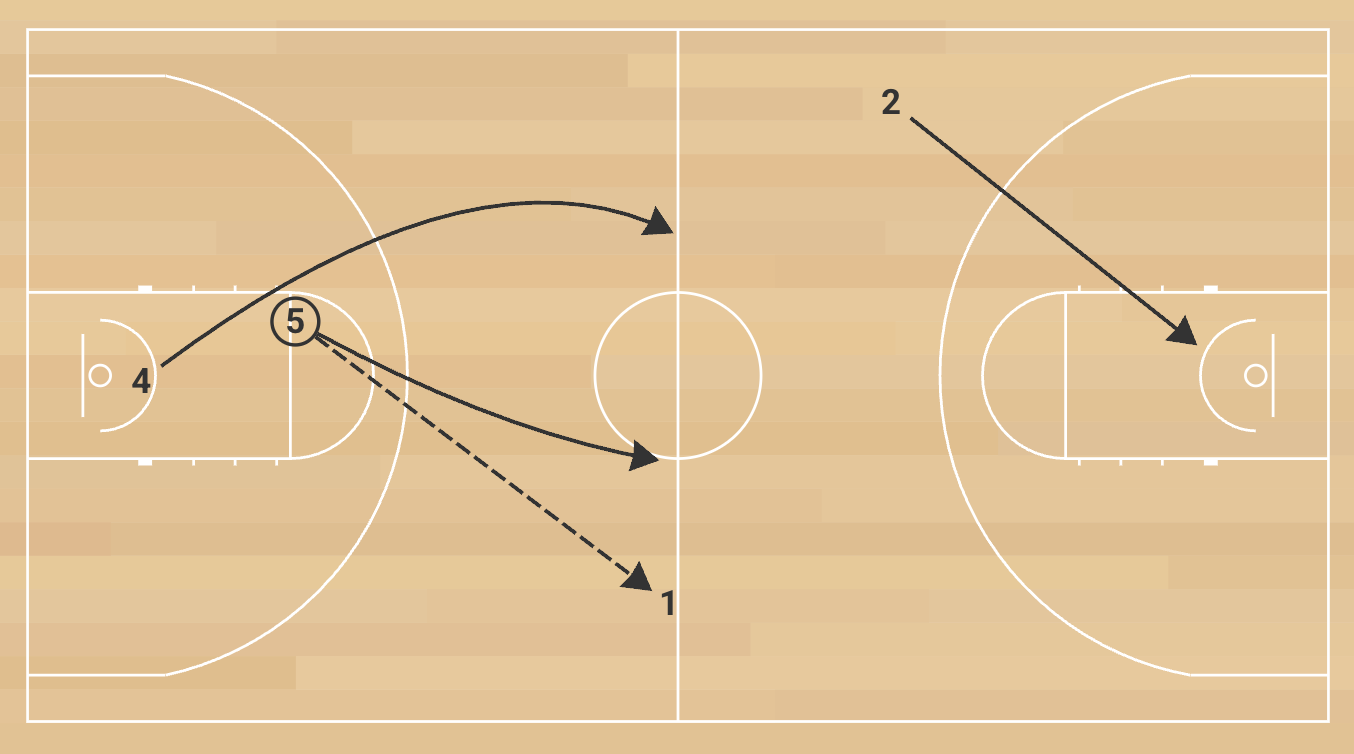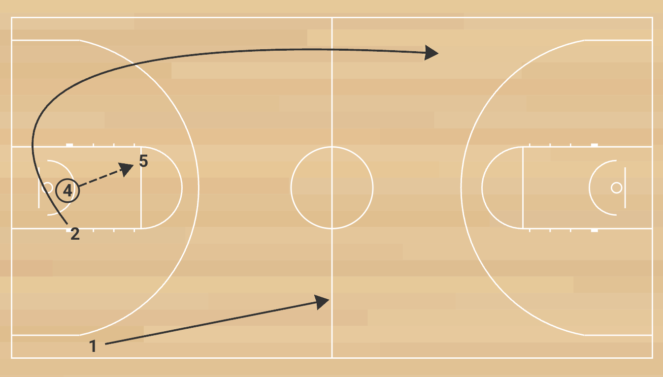 The initial frontcourt passer follows his pass and fills the opposite inside lane. The receiving frontcourt player immediately passes ahead to the backcourt player sprinting the sideline. That player quickly throws a cross-court pass to the opposite backcourt teammate cutting hard toward the rim for a layup. The first frontcourt player who made the opening pass must sprint the floor to take the ball out of the net without it touching the ground. On the trip back, the sequence repeats: outlet to the other frontcourt player, ahead to a wing, cross-court to the opposite backcourt player for a layup. The break is complete only when the ball is retrieved cleanly from the net a second time without mistakes.
