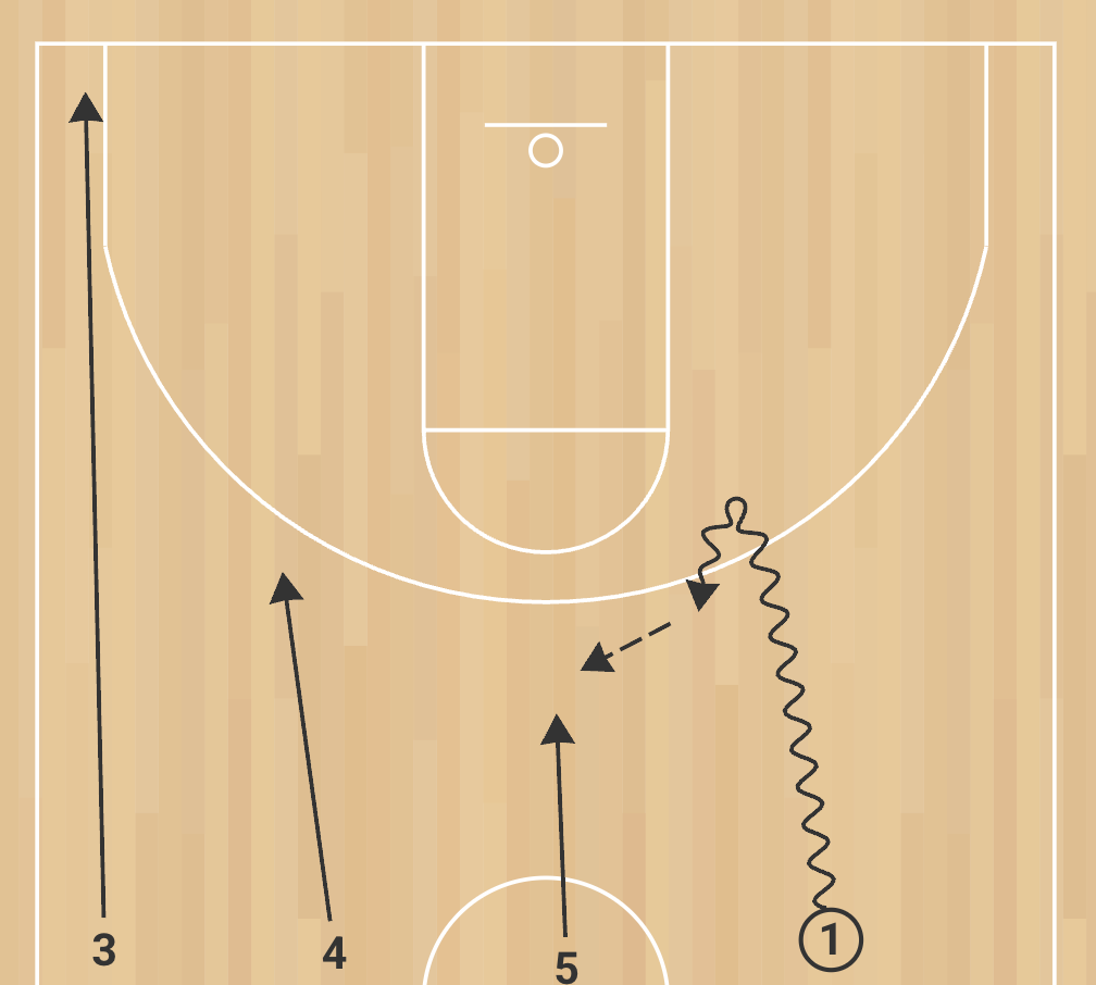 Four lines are formed at half-court. One line starts on the right side of the jump circle with the ball, one on the left side of the circle, one in the middle as the trailer, and one wide on the sideline. The drill is run 4-on-0 into a half-court offense. Players must sprint into their spots to simulate transition entry. The ball always begins with the guard attacking the right-side elbow, with the trailer filling the top of the key, the weak side wing moving into the slot, and the strong side wing filling deep corner.