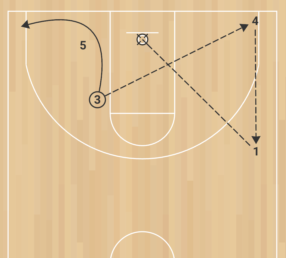 One attacks the right elbow, then swings the ball to the trailer at the top of the key. After passing, one cuts to the right baseline corner to fill. The trailer swings the ball to the left-side slot and then cuts into a give-and-go or sets up a dribble-at action. From here, the slot player can dribble at the wing, who either takes the handoff or cuts backdoor. The wing action continues into a “get” action, where the guard receives the ball back and initiates penetration. The drill continues with ball reversals, penetrations, and re-spacing, all within the 4-on-0 structure. Players should look to score within three passes or less, always reading spacing and cutting opportunities.
