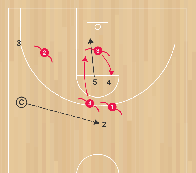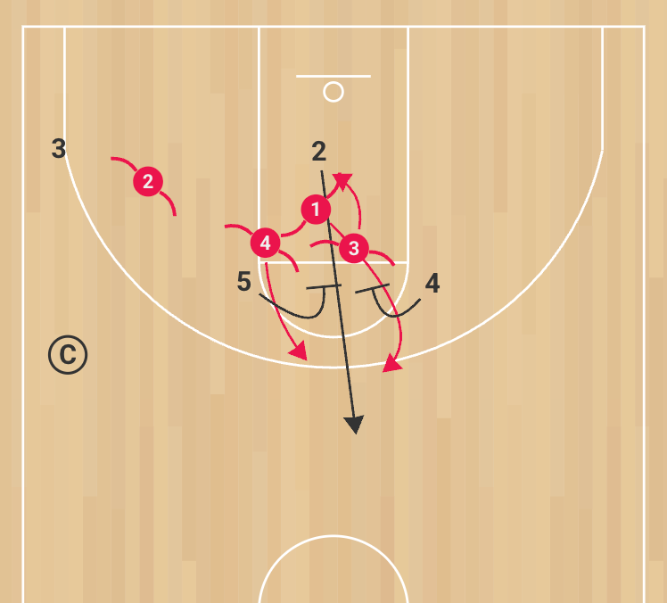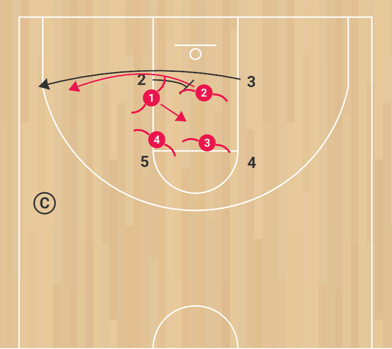 This drill is run 4-on-4 with a coach on the sideline holding a basketball to initiate play. The offensive unit is scripted to run three consecutive possessions with specific actions, while the defensive unit must string together three straight stops. We often use this drill to rehearse opponent scout actions, such as cross screens, elevators, or ball screens, while demanding complete focus from the defense.