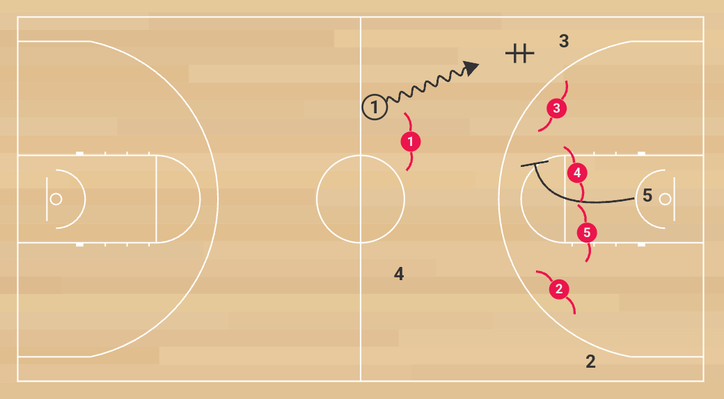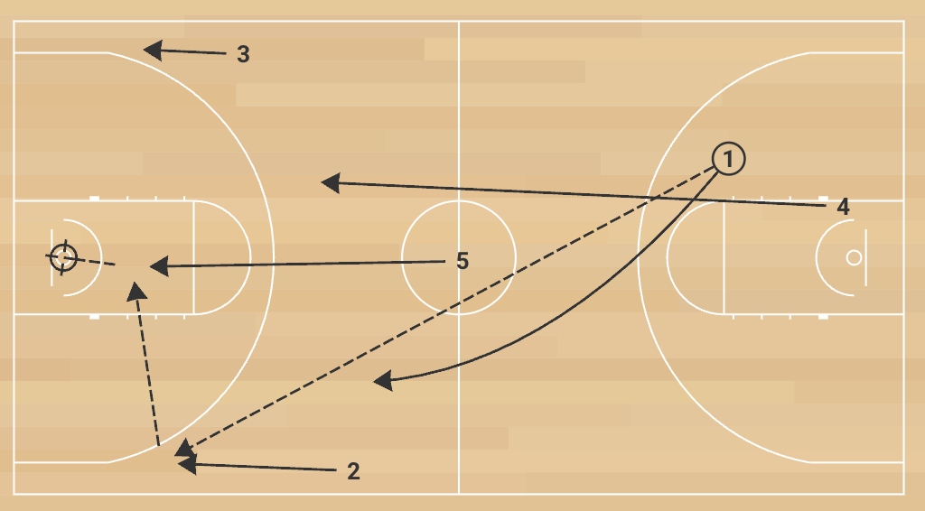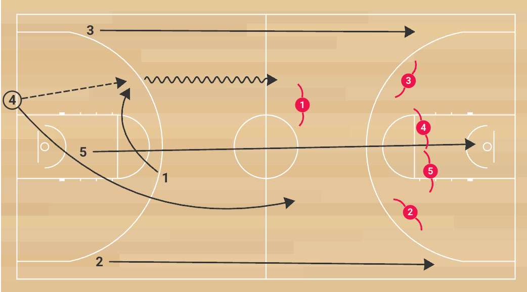 1. The drill starts with the offensive unit running a 5-on-0 break. The point guard receives the outlet, wings fill wide, and the rim runner sprints the lane. The goal is to find a quick score within 4–6 seconds. This could be a pitch-ahead three, a pass to the rim runner, or a direct drive.