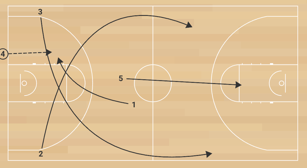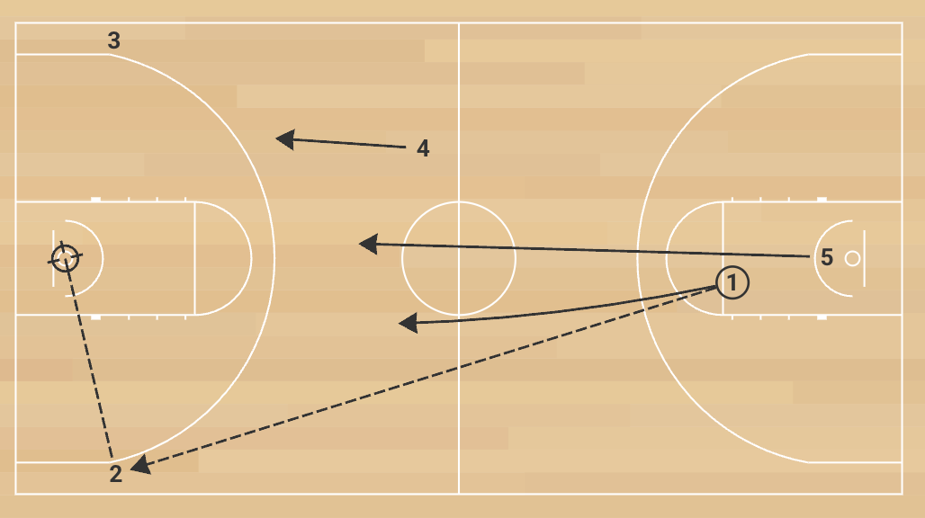 Place a full five-man unit on the baseline, positioned as they would be in a real game lineup. One of the forwards begins by tossing the ball off the backboard to simulate a rebound. He then outlets to the point guard, who receives with a banana cut. Wings sprint wide and fill the deep corners, while the center sprints to the rim as the rim-runner. The first trip is the primary break with the goal of an immediate score. After a make, the original rebounder becomes the inbounder and retrieves the ball out of the net before it hits the floor. The point guard receives the next outlet and initiates the secondary action into a flow entry at the opposite end.
