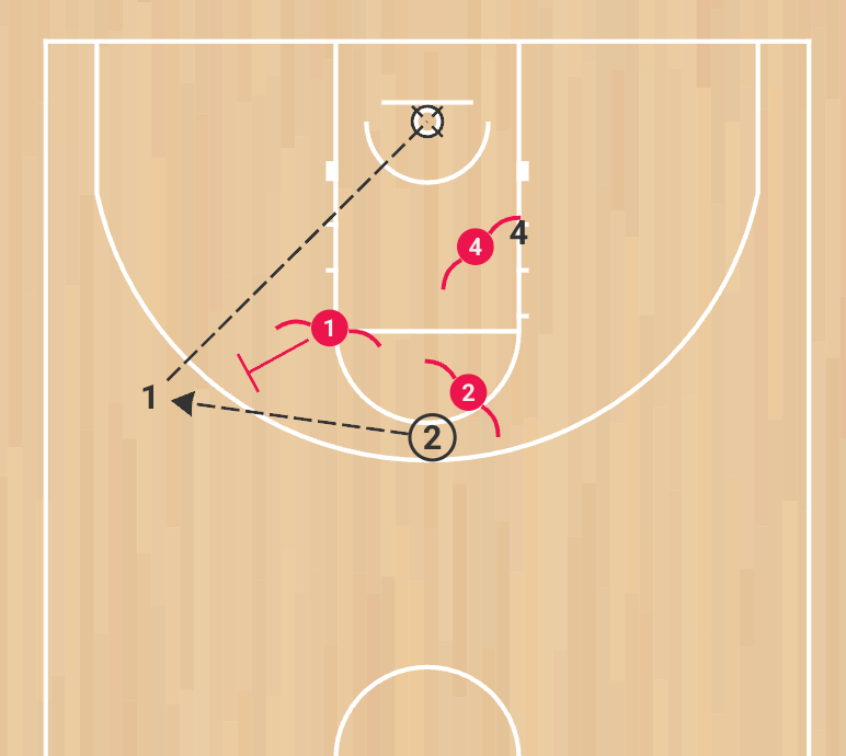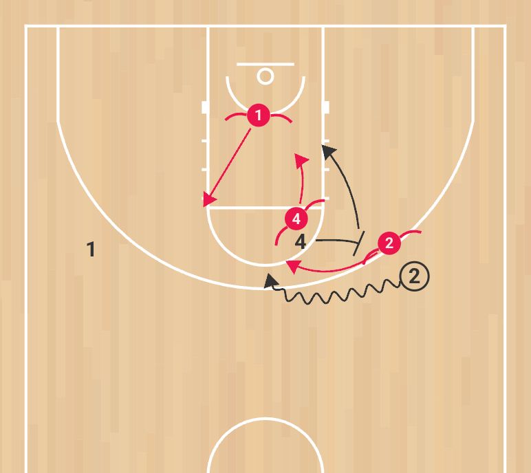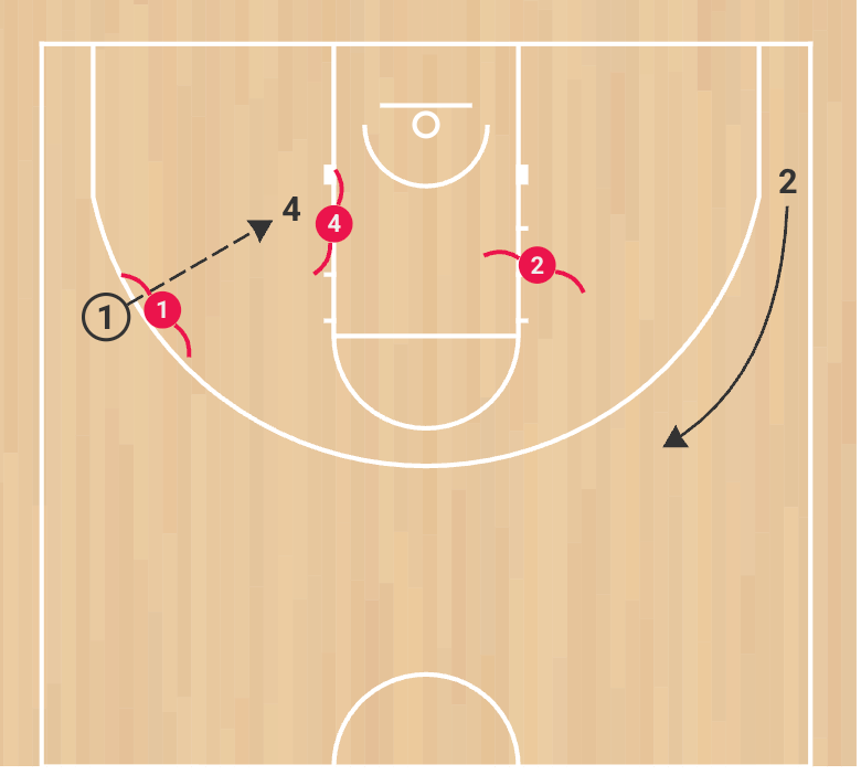 2. 4 cuts into the mid-post; his defender fights for three-quarter deny positioning.