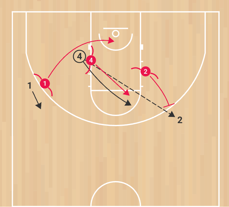 5. 2 lifts from the corner to the weak-side slot; 4 passes out of the post to 2, then follows with a ball screen.