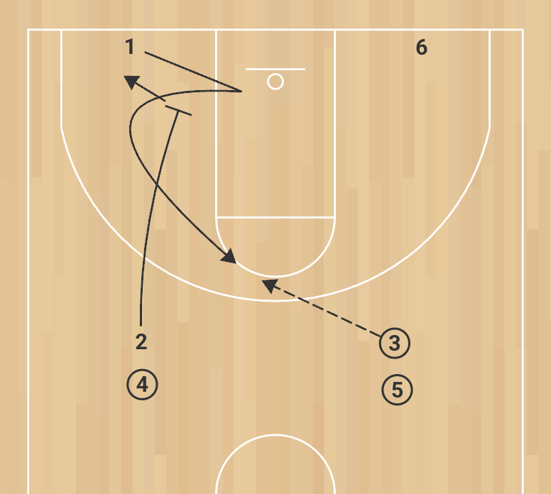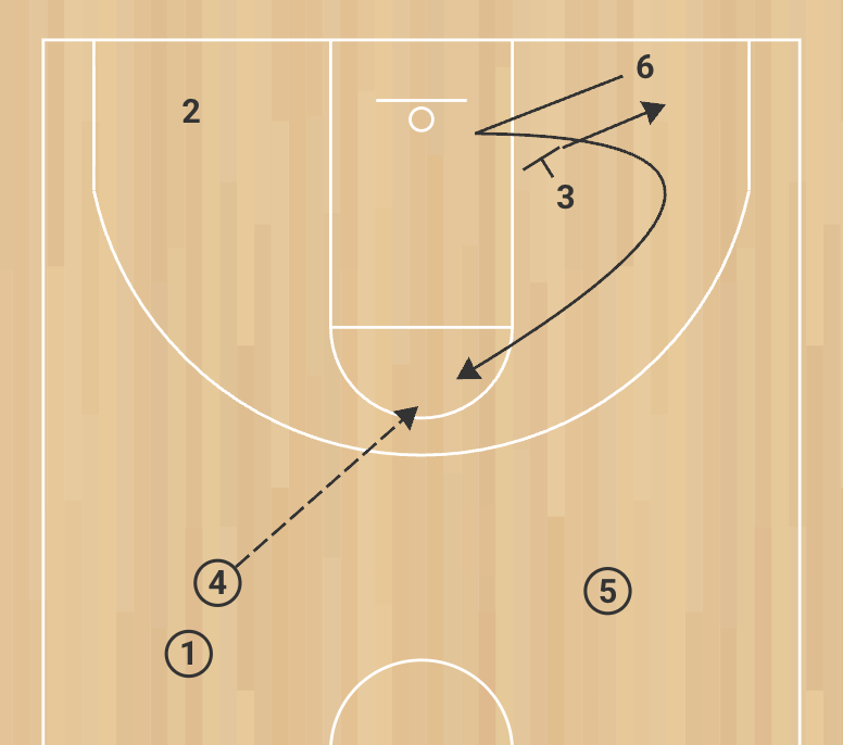 As the screener arrives, the receiver sets up his defender by stepping into the paint, then snaps back tight off the screen (shoulder-to-hip) to the foul line / slot for the catch. The diagonal passer delivers the ball on time, on target for a rhythm shot. The shooter rebounds and fills the passer’s half-court line. The screener immediately releases to the baseline with hands ready (becoming the next receiver on that side). The passer, now without a ball, becomes the next screener on the opposite side. The action flows continuously, alternating sides: screen → come off → diagonal pass → shot → rebound and rotate. Emphasize waiting for the screen to be set before the cut; receiver must show target (palm of shooting hand) and call the passer’s name; passer calls the receiver’s name.