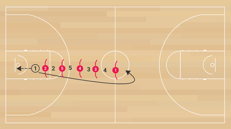 The drill begins with all ten players stacked in a single line under the basket, alternating offensive and defensive players. The first player in line has a ball and tips it repeatedly against the backboard. Each player follows, tipping the ball in turn and then rotating to the back of the line. The coach controls the start with a whistle. On the whistle, the next player in line catches the ball instead of tipping it, and that team immediately becomes the offense. The other five players instantly convert into the defensive unit.