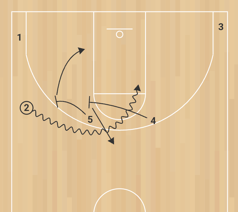 Setup: 1 top with ball, 2 left wing, 3 right corner, 5 left elbow, 4 right elbow.