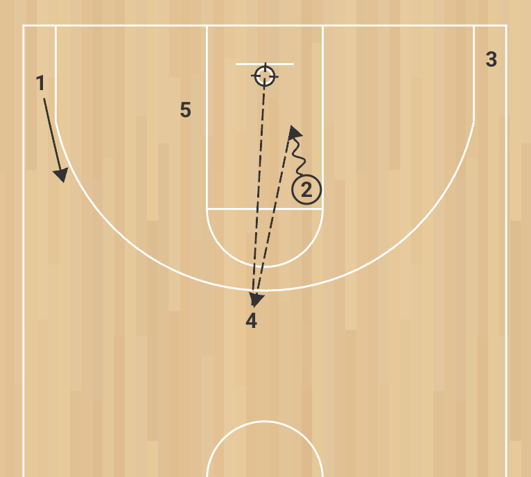 1 passes to 2 on the wing, then cuts through to the left corner.