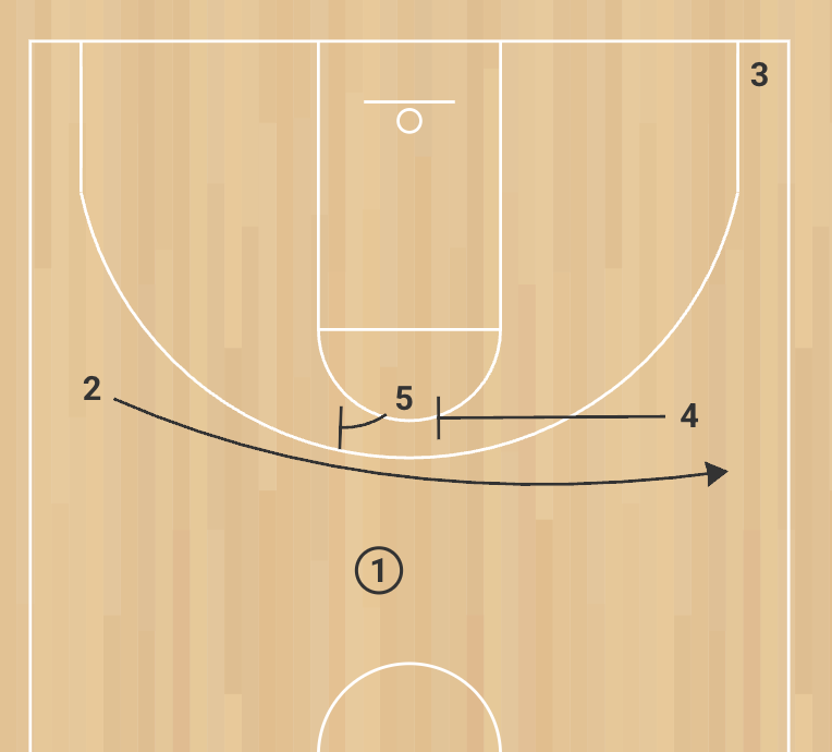 3 steps in; 3 and 5 form an Iverson screen for 2 to sprint from left wing across to the right wing (draw help/attention).