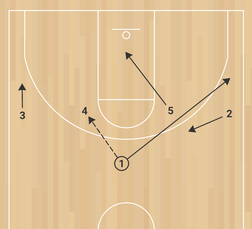 • Start in a 1–4 high alignment: 1 top, 4 left elbow, 5 right elbow, 2 right wing, 3 left wing.