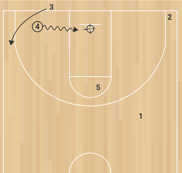 The inbounder (3) can use a dribble handoff with 4 after the entry to disguise the isolation, or 4 can face up immediately and attack.