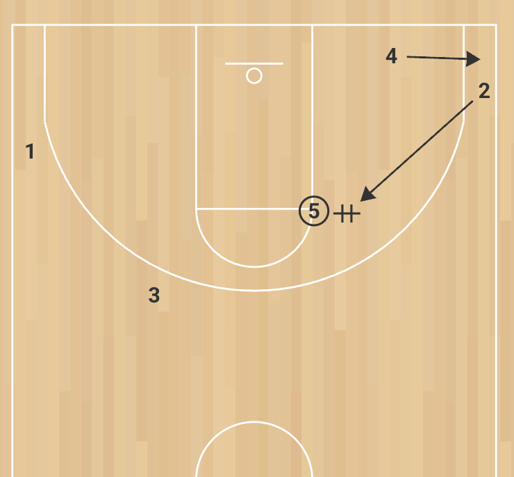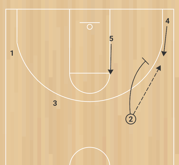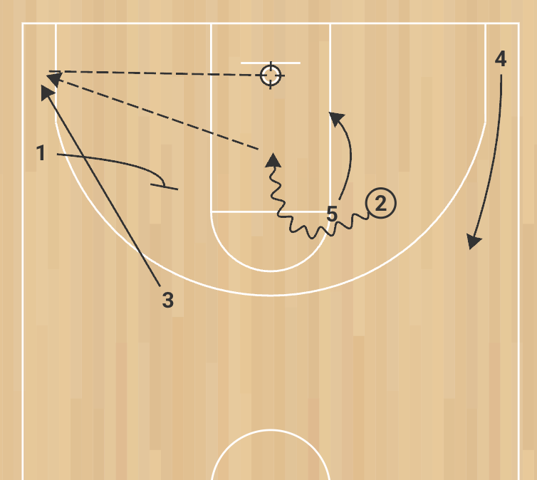 2 can score, hit 4 lifting behind, find 5 on rim run, or skip to 3 in corner.