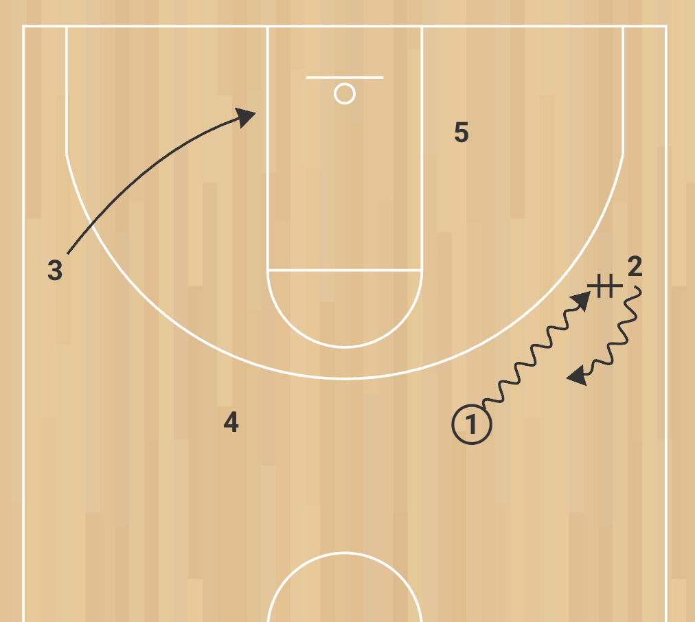 • 1 initiates with a dribble handoff to 2, while 3 cuts down to the left block.