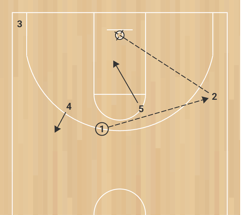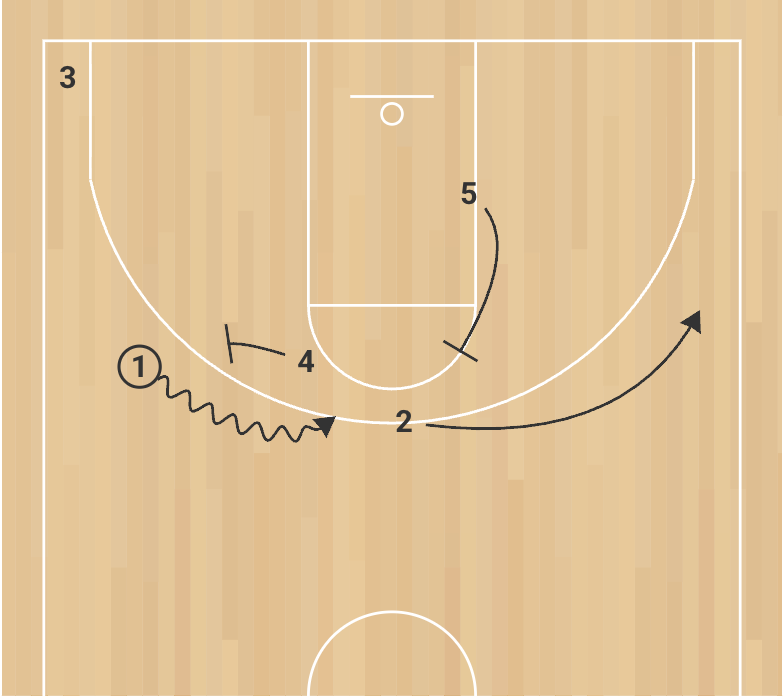 Reads: 1 can hit 2 (primary option) for a catch-and-shoot three, hit 4 popping after the ball screen, or find 5 on the roll for a layup.