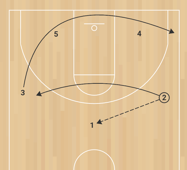 4 flashes from the right short corner to the ball-side elbow, while 5 finds space in the ball-side short corner.