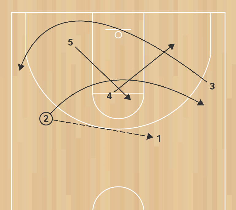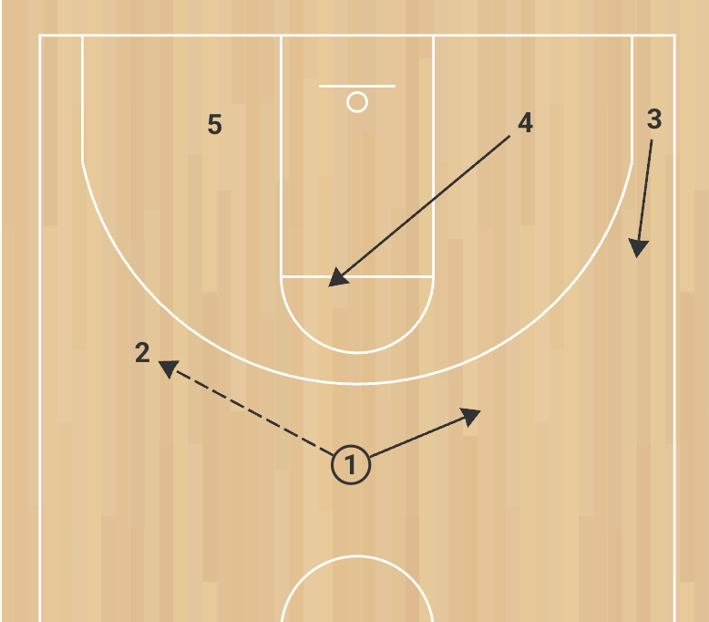 On the reversal, 1 cuts below the top two defenders across the foul line to the left wing.