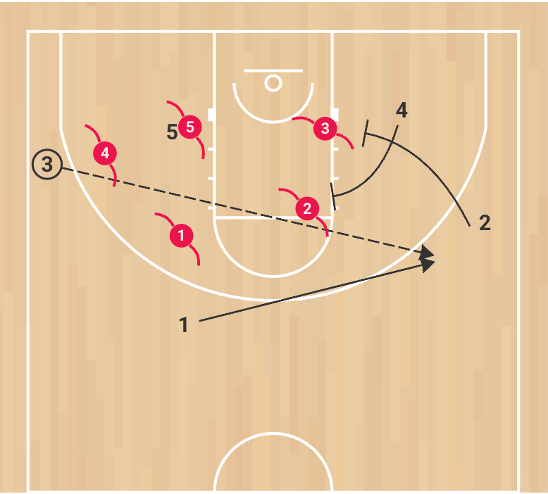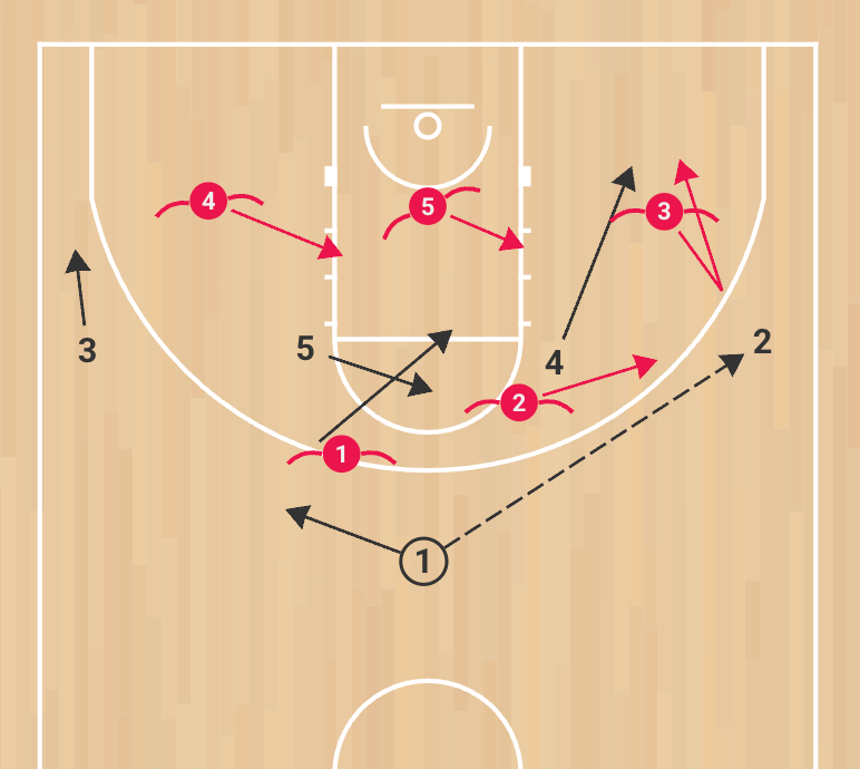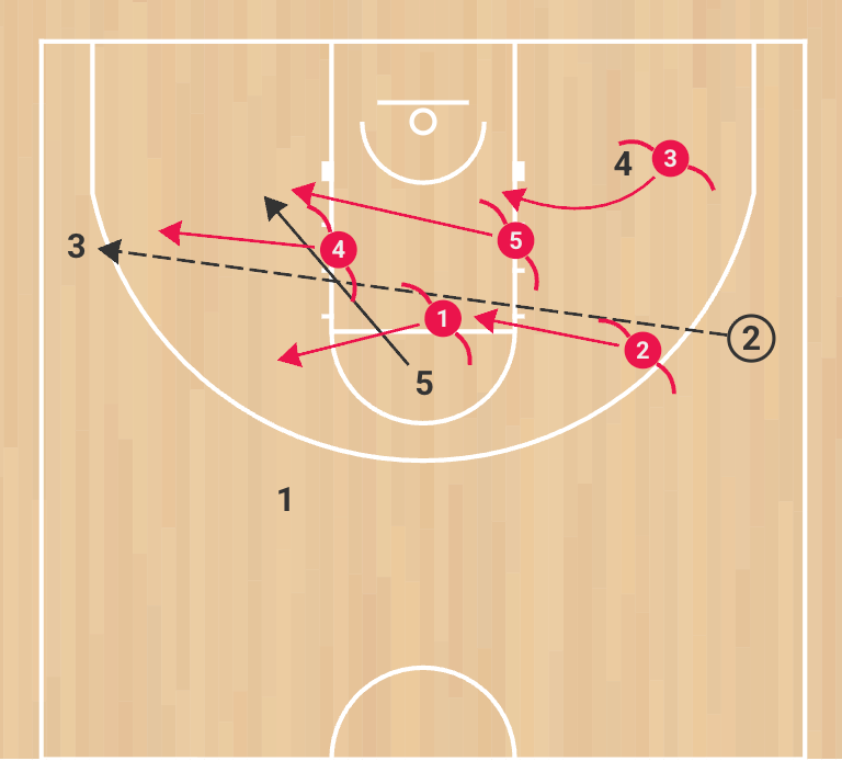 3 rotates high for transition defense; 5 crashes the glass from an ideal offensive rebounding position