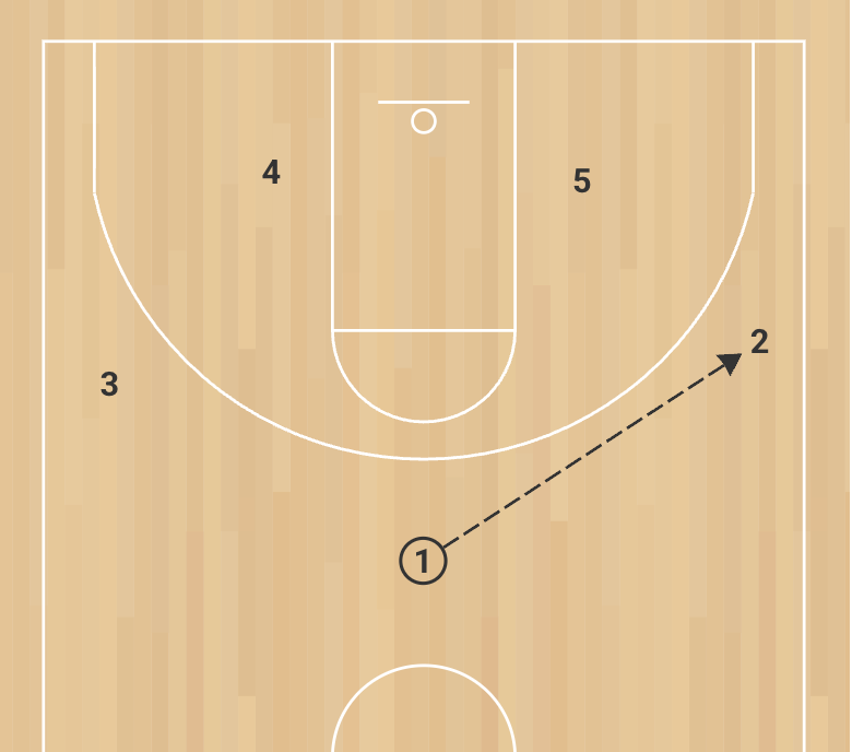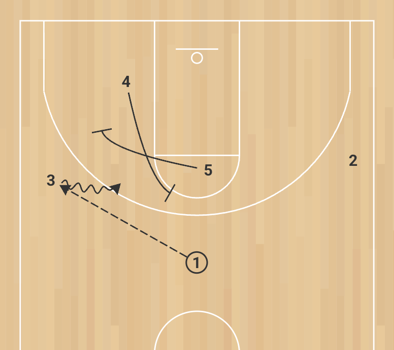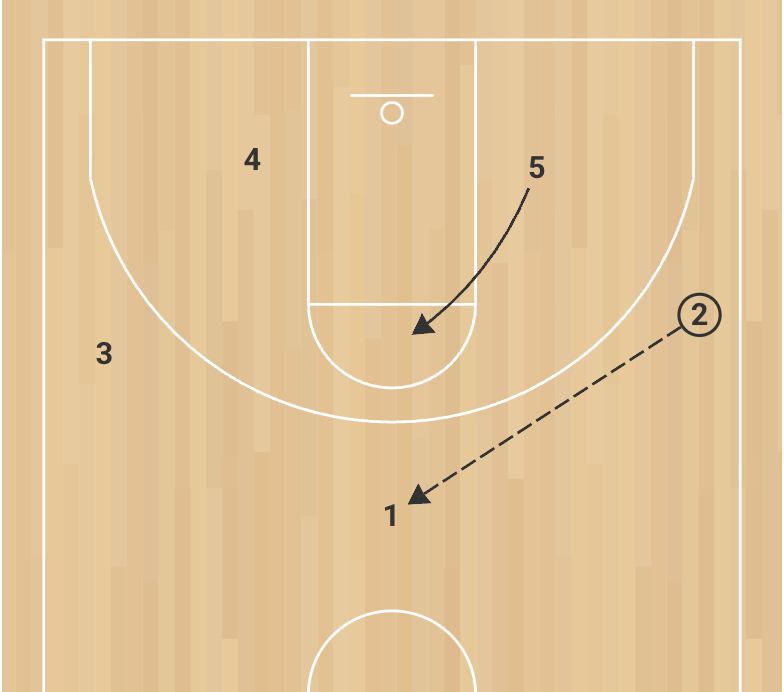Options: finish at the rim, hit 5 on the roll, kick out to 4 popping to the wing, or skip to 2 drifting to the right baseline corner.