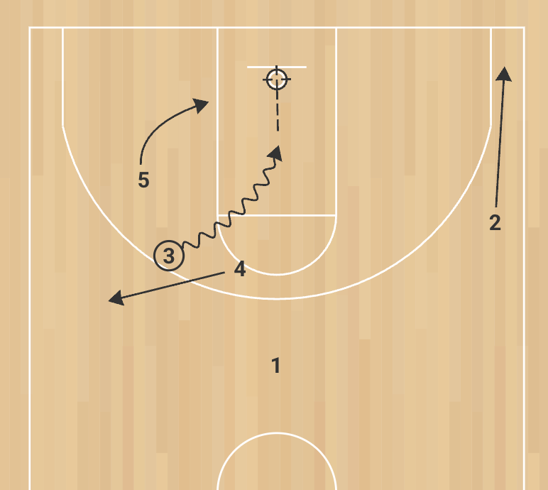 On the initial pass, 5 flashes from the right short corner to the foul line, occupying the middle defender.